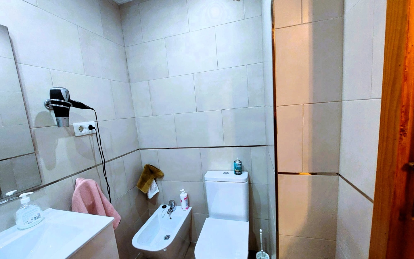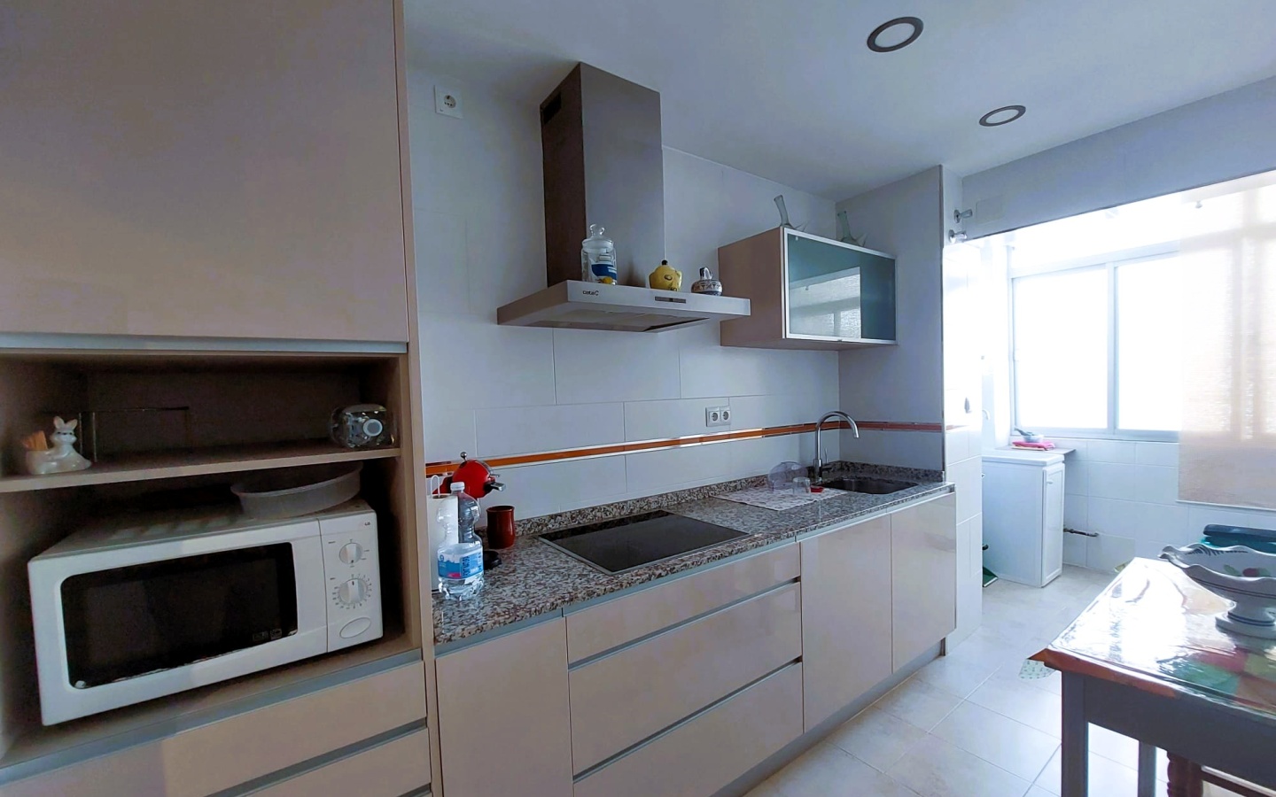 Totalmente Reformado: El piso presenta un excelente estado de conservación con reformas que le aportan un estilo moderno y funcional, especialmente en la cocina totalmente equipada (como se aprecia en la imagen) y los dos cuartos de baño (uno con ducha de azulejos morados y otro con plato de ducha moderno).