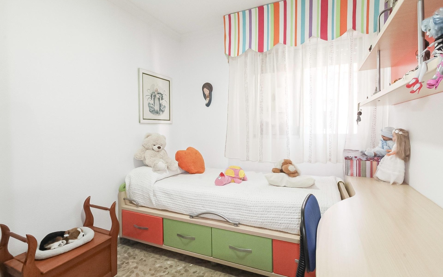 Espacio y Confort: Con sus 4 dormitorios (incluyendo uno infantil con coloridos muebles y otro habilitado como sala/despacho), ofrece el espacio ideal para una familia grande o para aquellos que necesitan un estudio u oficina en casa.