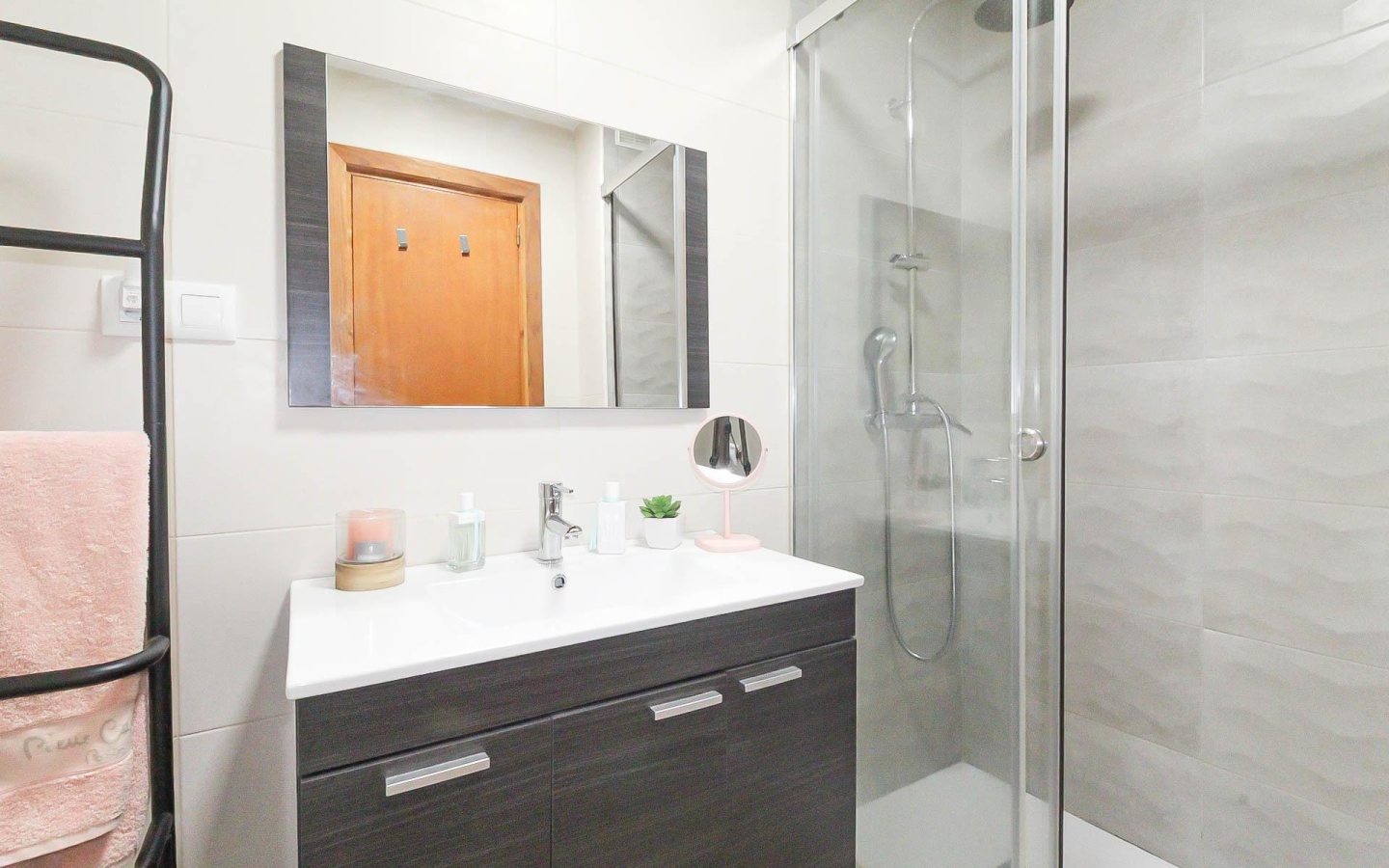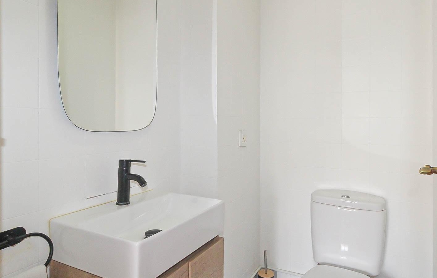 Baños Modernos: Dispone de 2 baños completos, uno de ellos con un diseño actual y un mueble de lavabo oscuro.