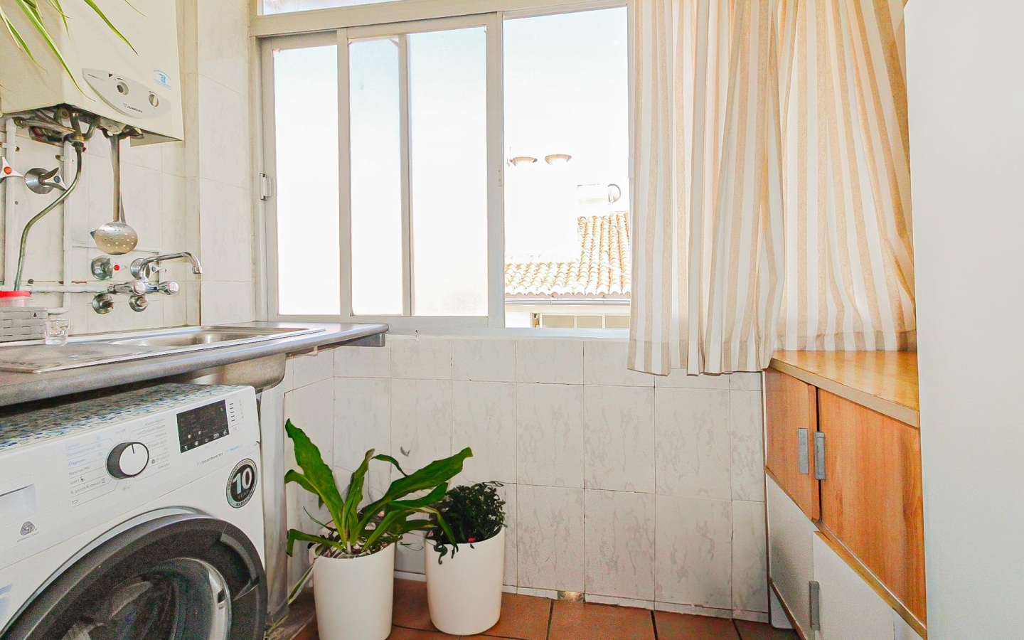 Equipped Kitchen: The separate kitchen is fully equipped with appliances and features a functional black and white design. It also includes a practical adjoining laundry room with a washing machine and water heater.