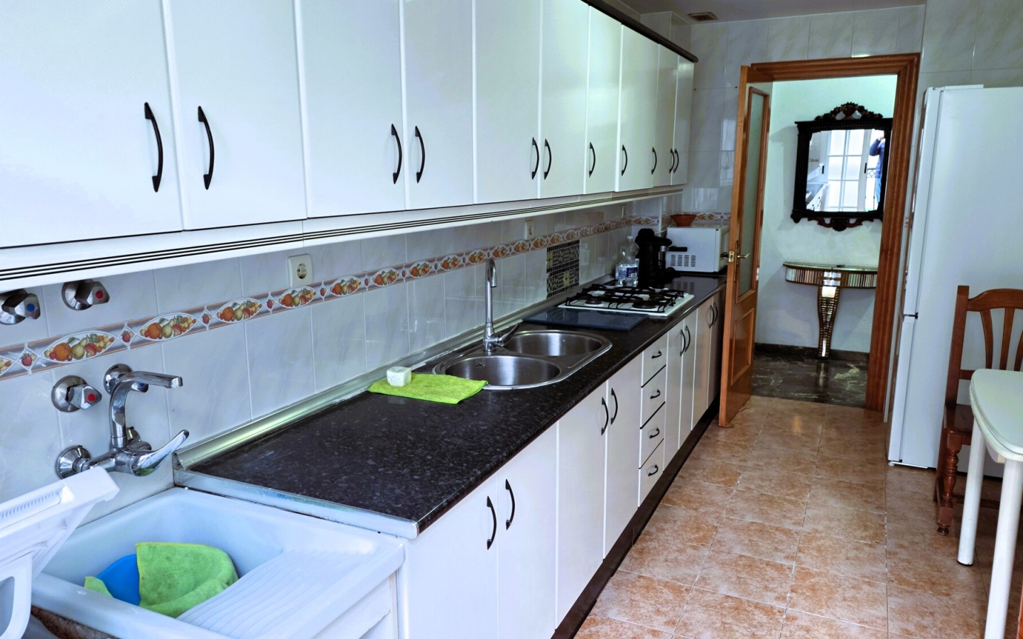Zona de Día: Al entrar, un funcional recibidor conecta con un práctico aseo de cortesía. La cocina independiente destaca por su diseño rectangular, gran capacidad de almacenaje y un generoso ventanal que garantiza ventilación y luz natural.