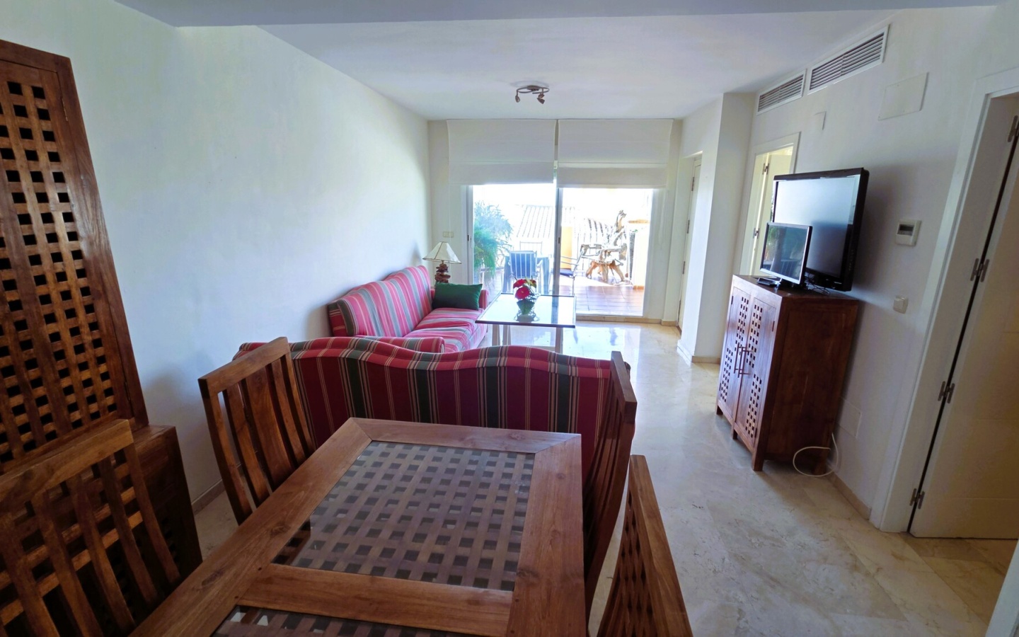 Planta Principal (Vida Social): Al entrar, nos recibe una amplia terraza soleada, el espacio ideal para disfrutar de desayunos al aire libre o comidas familiares. El interior alberga un gran salón-comedor exterior con acceso directo a la terraza, una cocina independiente totalmente amueblada, un práctico aseo de cortesía y acceso a las plantas superior e inferior.