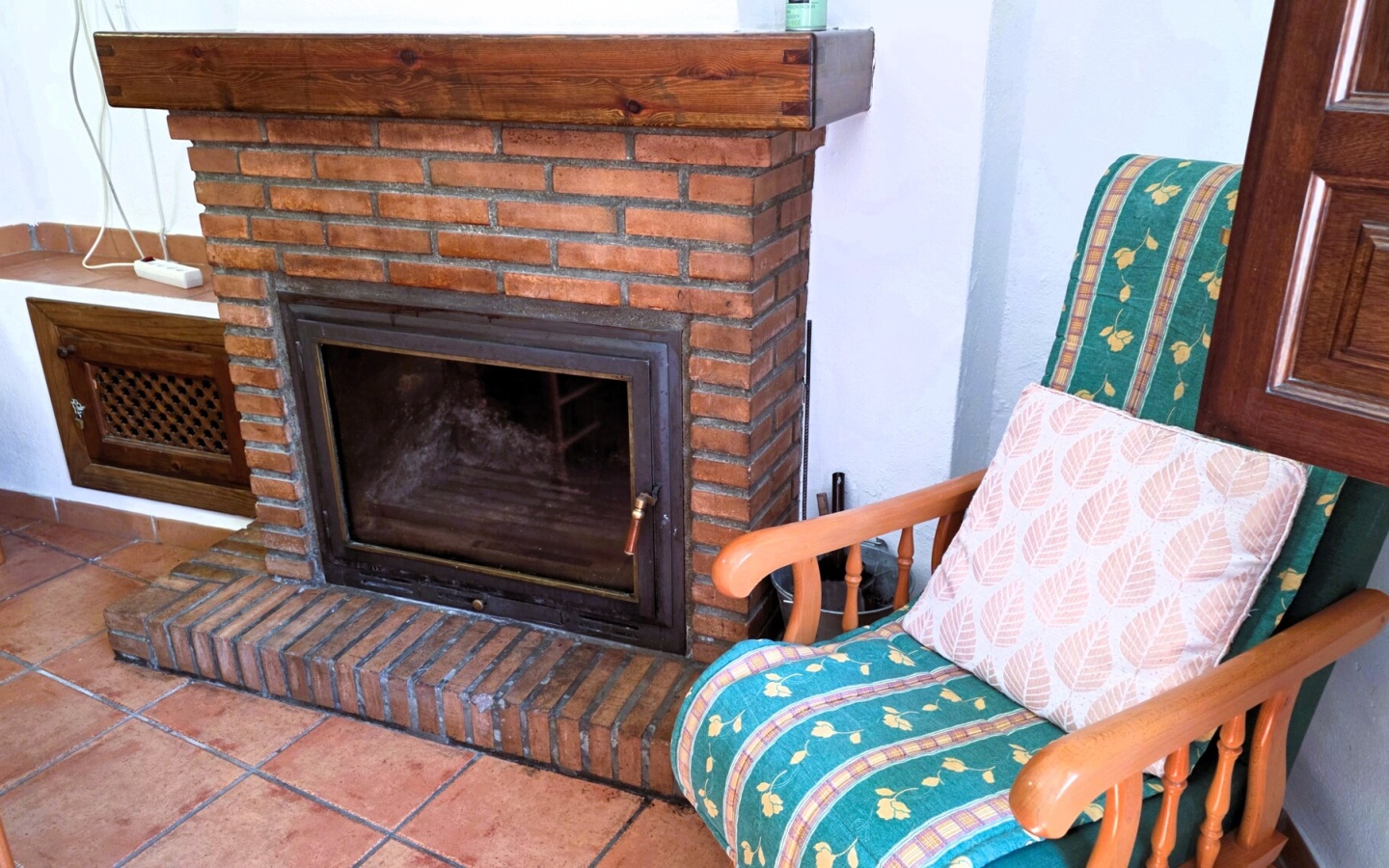 Planta Baja (Zona Social): Al entrar, nos recibe un amplio salón-comedor de concepto abierto (open-plan) que invita a la reunión. El corazón de esta estancia es una gran chimenea de ladrillo visto, que no solo aporta calidez estética, sino que alimenta el sistema de calefacción de toda la casa. La cocina abierta, con mobiliario de madera de alta calidad y barra americana, está perfectamente integrada. Esta planta se completa con un práctico aseo.