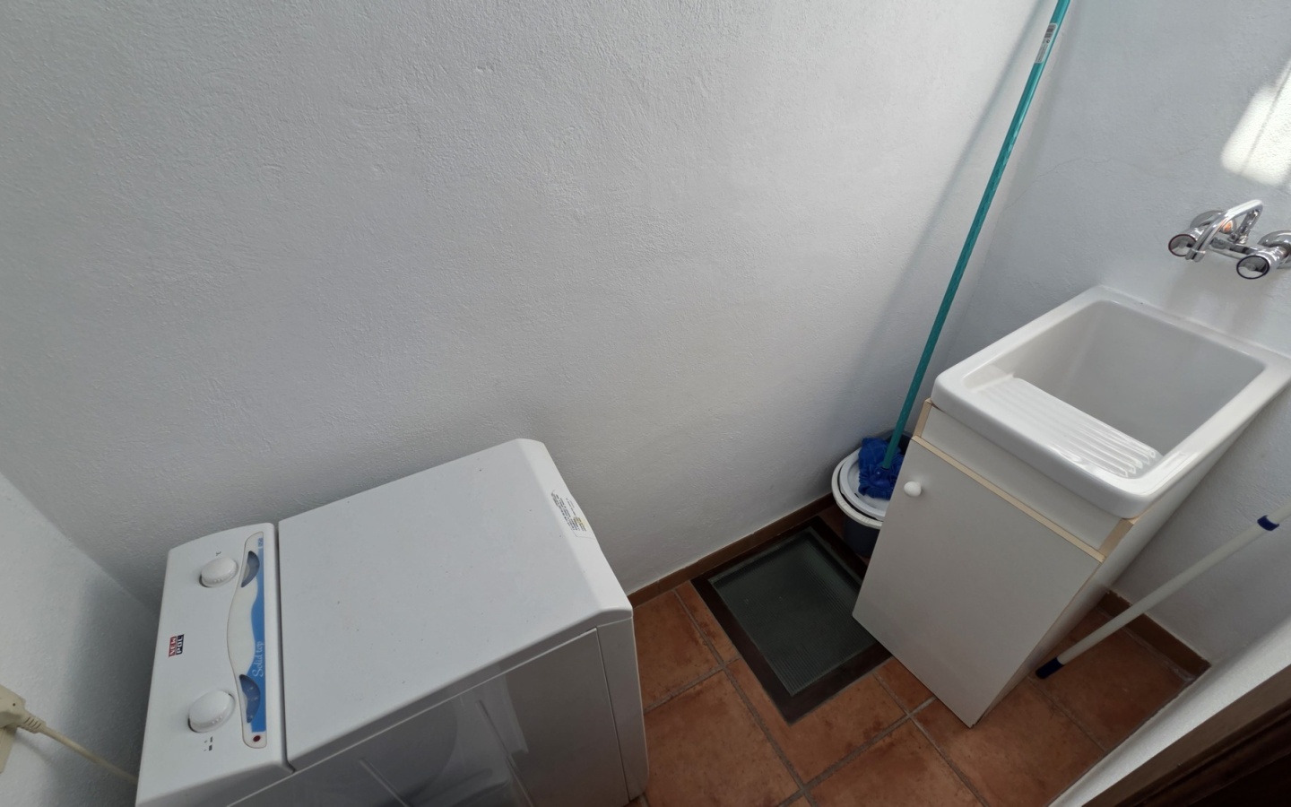 Un baño completo con plato de ducha y una funcional zona de lavadero.