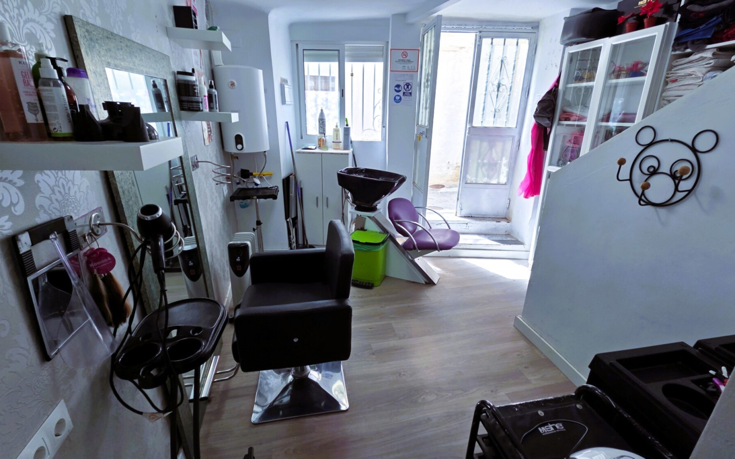 La planta baja está totalmente acondicionada como salón de belleza y peluquería, aprovechando la entrada directa desde la calle.