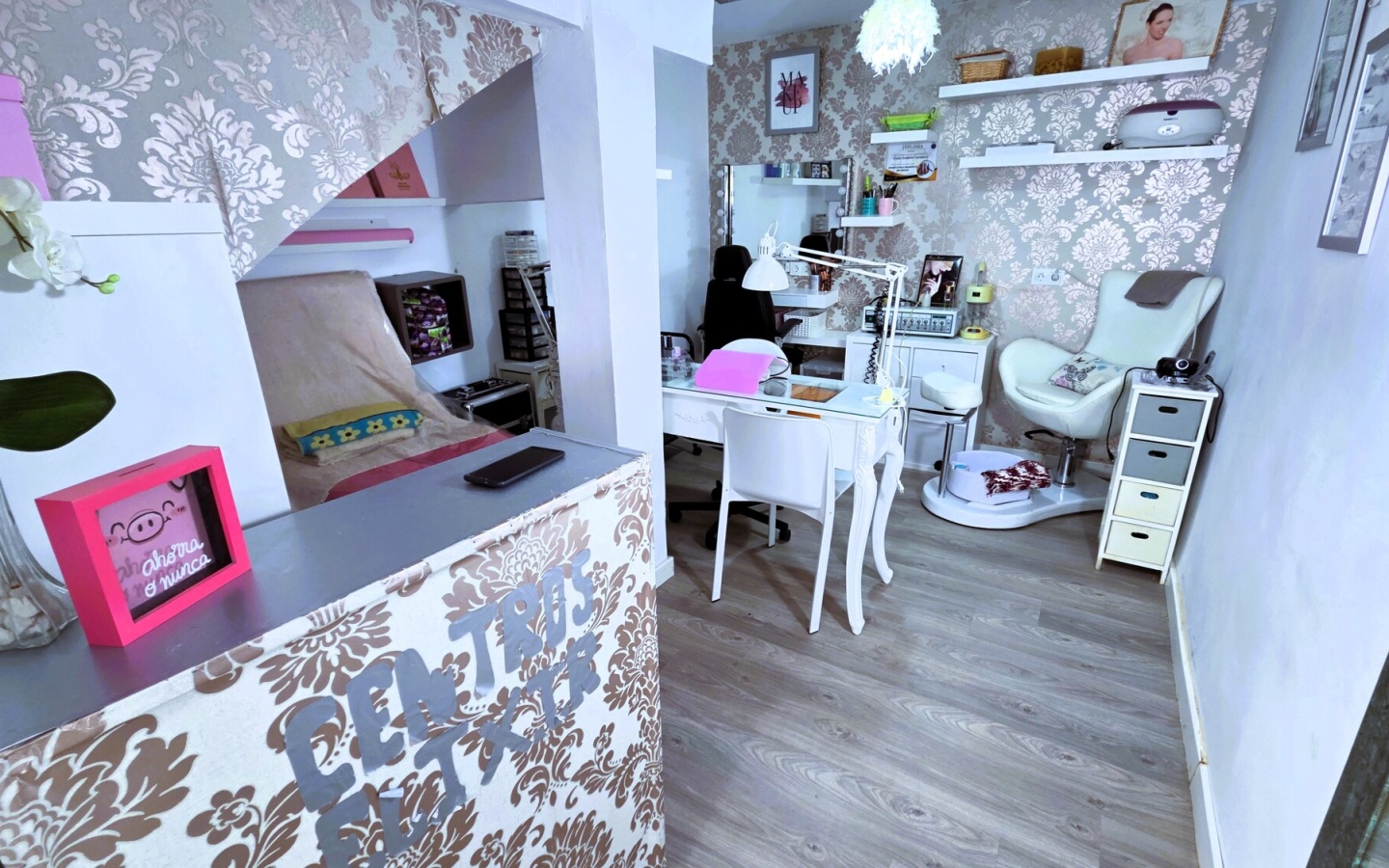 Estética/Manicura: Espacio diferenciado con una mesa de manicura profesional, lámparas de secado y mobiliario de almacenaje específico.