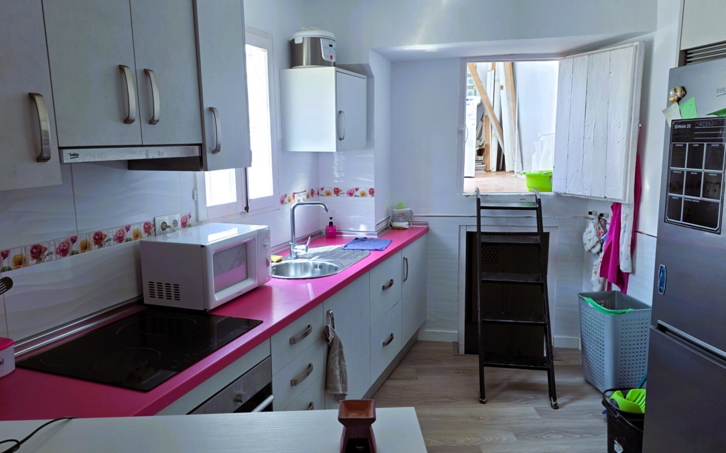 Cocina: De estilo moderno y atrevido con encimeras en color rosa fucsia. Está totalmente equipada con vitrocerámica, horno, microondas y una amplia zona de armarios en blanco.