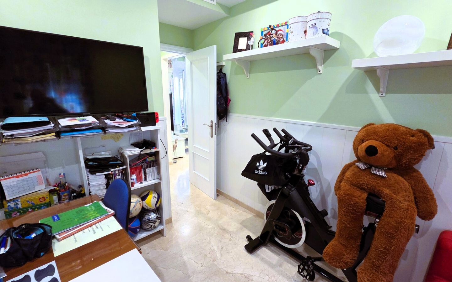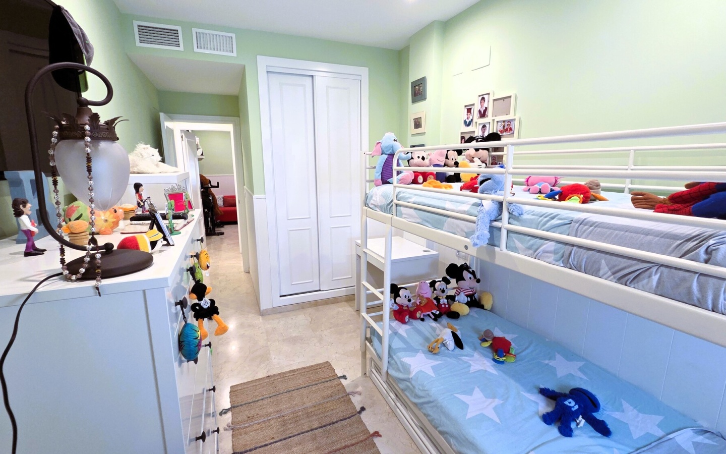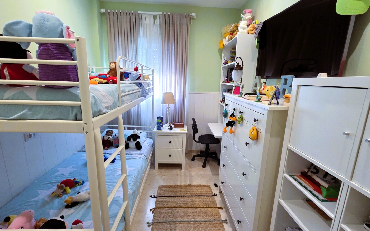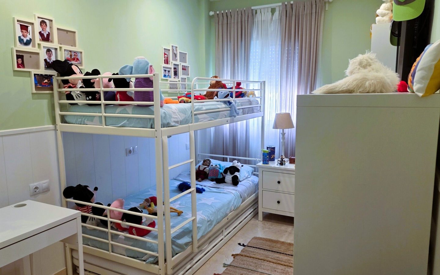 3 Dormitorios: Incluye un dormitorio principal con baño en suite y dos dormitorios adicionales, uno de ellos equipado con literas y un espacio lúdico/de estudio, y otro utilizado como despacho/sala de juegos con sofá-cama, ofreciendo gran versatilidad.