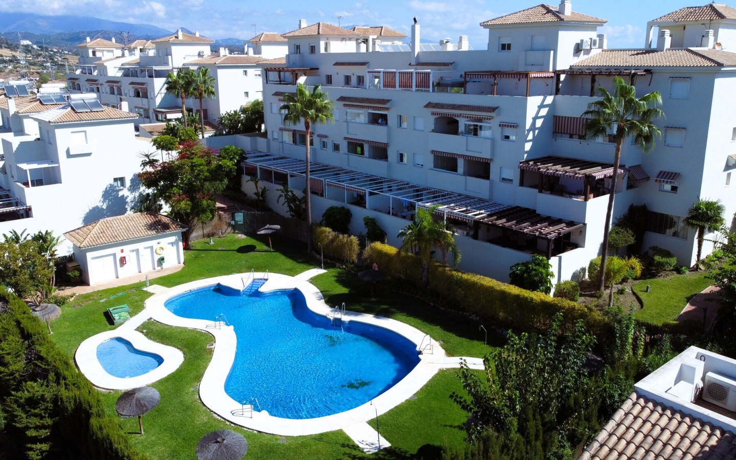 Piscina Comunitaria: Disfrute del sol de la Costa del Sol en la espectacular piscina con forma orgánica, que incluye una zona infantil separada, todo ello rodeado de césped y sombrillas naturales.