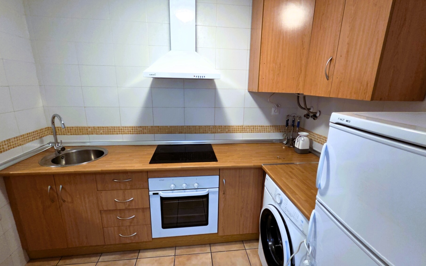 Cocina Equipada: Espacio optimizado con mobiliario en tonos madera, vitrocerámica, horno y zona de lavandería integrada.