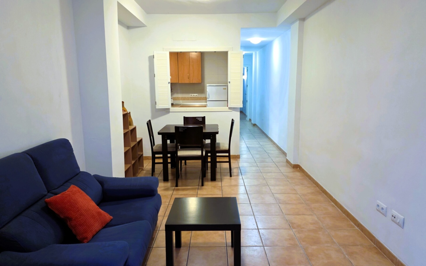 Corazón de la vivienda: Salón-comedor acogedor y funcional que conecta visualmente con la cocina a través de una práctica ventana pasaplatos.