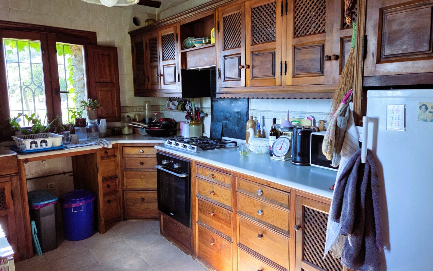 Cocina rústica totalmente equipada, práctica y funcional, junto a la zona de estar.