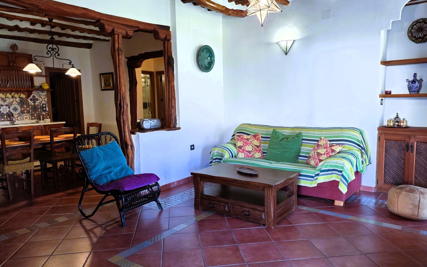 Estilo: Fusión de encanto rústico alpujarreño (techos con vigas de madera vistas, ladrillo visto) y toques bohemios y coloridos, creando un ambiente cálido y acogedor.