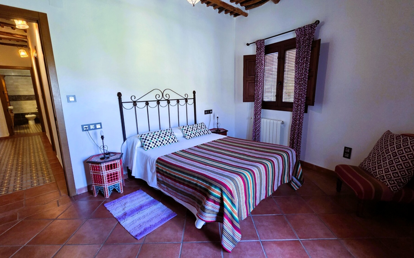 La vivienda cuenta con varios dormitorios diseñados para el descanso, todos manteniendo el encanto rústico de las vigas en el techo y los suelos de barro cocido: