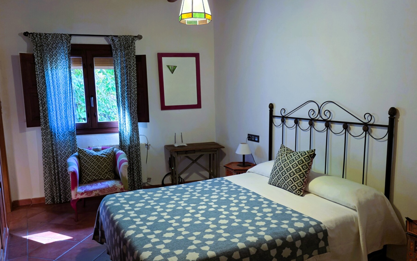 Dormitorio Principal: Amplio y con personalidad, destaca por su cabecero de forja, un armario de madera maciza con celosía y ropa de cama vibrante.