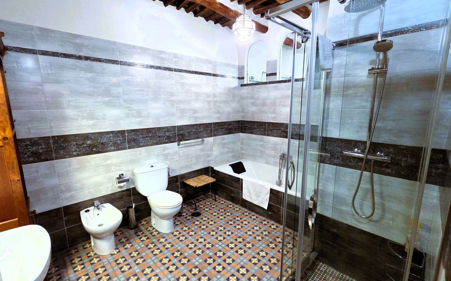 Baño 1: Un baño espacioso con ducha separada y bañera. Destaca por su revestimiento de azulejos en tonos gris y blanco con una franja decorativa, y un suelo de mosaico llamativo. Incluye inodoro y bidé.