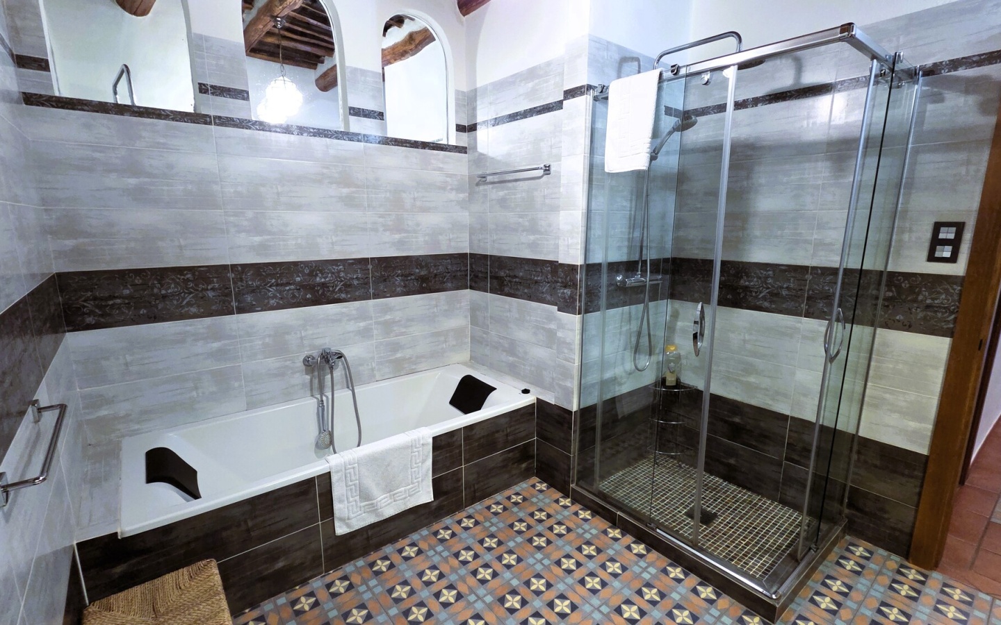 Baño 2: En suite, con una estética más rústica, combina azulejos en tonos verdes esmeralda y lima con una moderna mampara de cristal para la ducha.